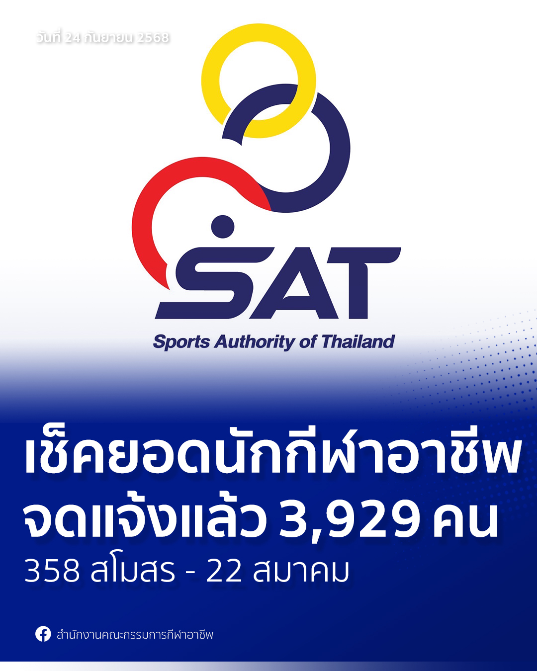24 September 2025เช็คยอดนักกีฬาอาชีพ จดแจ้งแล้ว 3,929 คน 358 สโมสร - 22 สมาคม